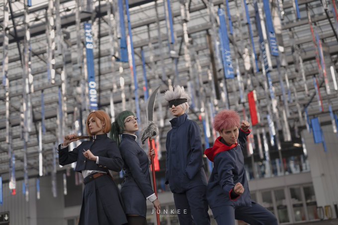 Hi! I am finally posting the first photo of the Jujutsu Kaisen group ☺️ ! ❤️ Nobara : me Maki : @xly_luu Gojo : @BlackDeamon_Edo Yuki : @AxMayhem 📸 : @junkeephotography #JujutsuKaisen #Cosplay #nobarakugisaki #Makizenin #GojoSatoru #yujiitadori