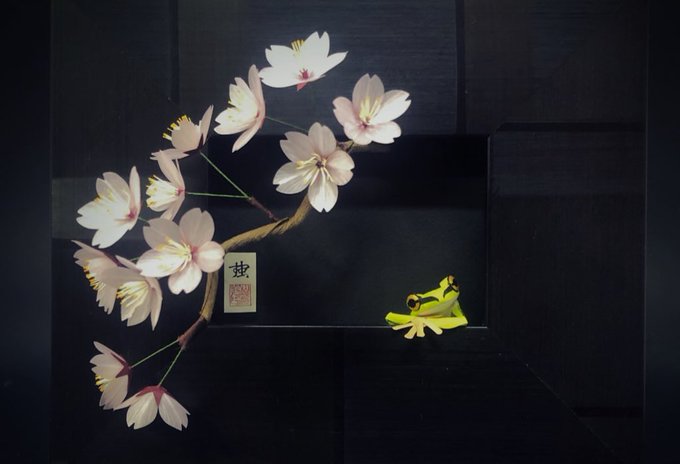 #あなたの心に触れてみたい作品展 花と小さな生き物の暮らす小さな風景を紙で作ります。 本来は無表情なカエルを表情豊かに、弱肉強食とは無縁の平和な世界に少しだけクスッとしてくれたらとても嬉しく思います。 下絵なしでダイレクトにハサミで切って作るので少しづつ顔も違い個性があります。