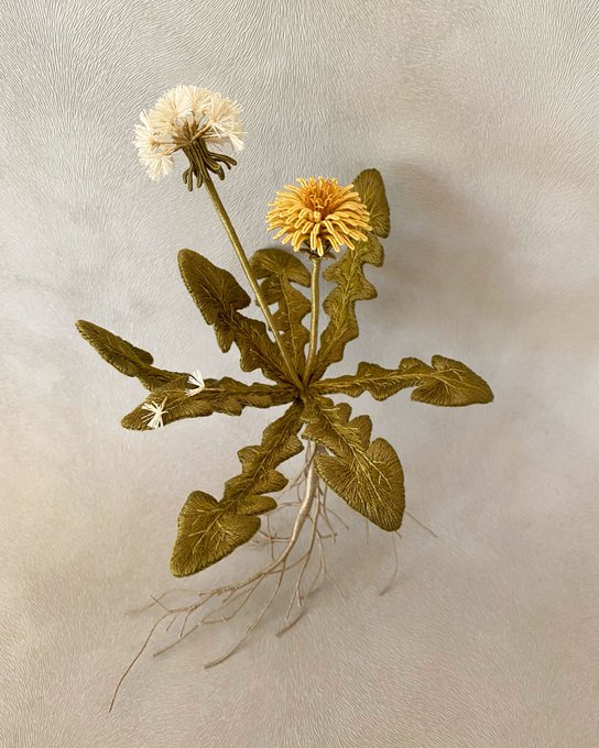 #あなたの春を待ってる作品を見せて #立体刺繍 の根付きタンポポ。 子供の頃、近所にタンポポ、シロツメクサなどが咲く土手や空き地が沢山あった。 花冠を作るつもりが夢中になって3mくらいに! そのまま友達と縄跳びして遊んだりしたな。 野の花は子供の頃の記憶にいつも繋がる。