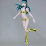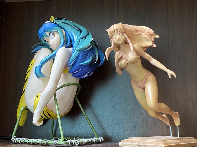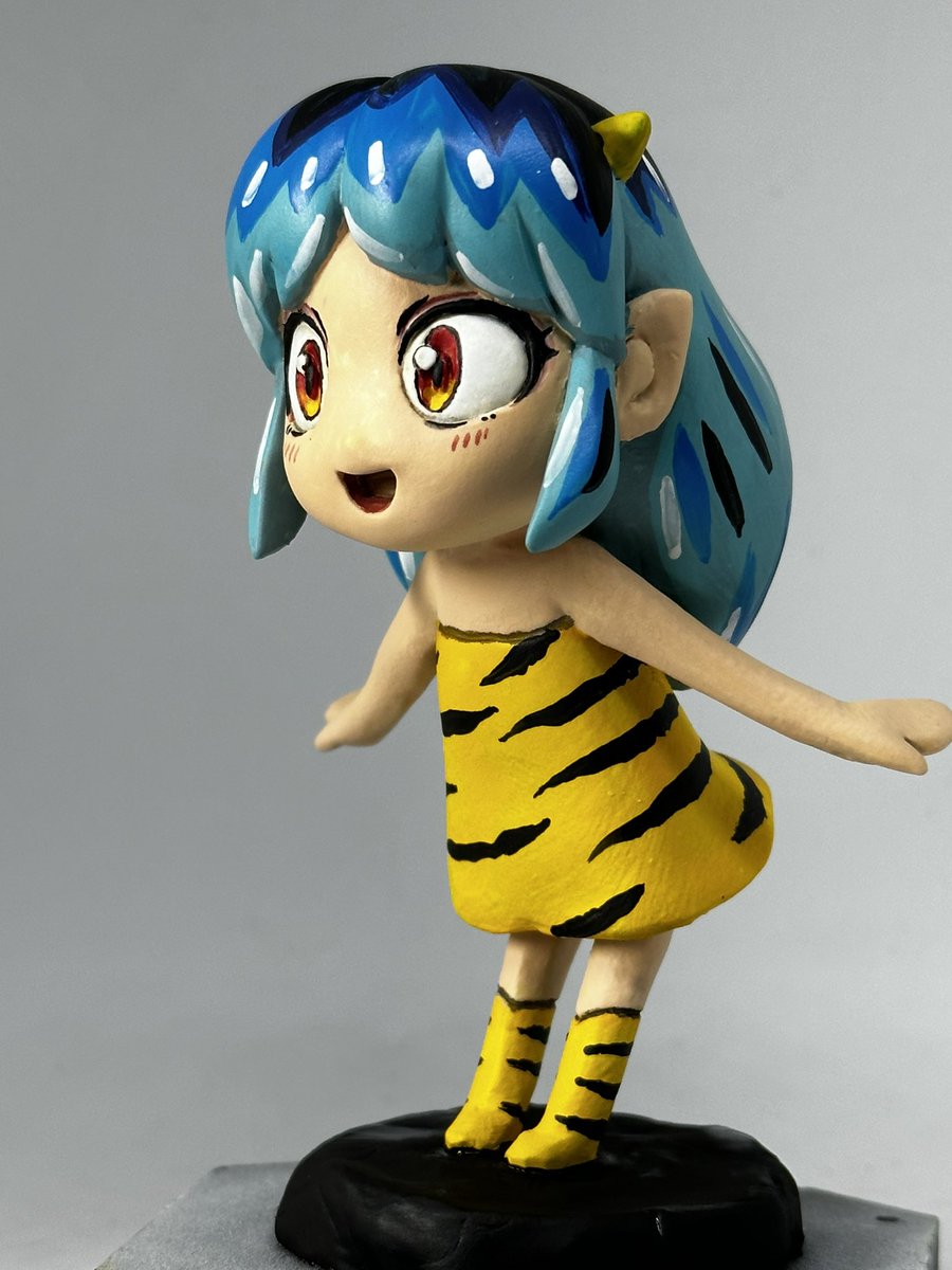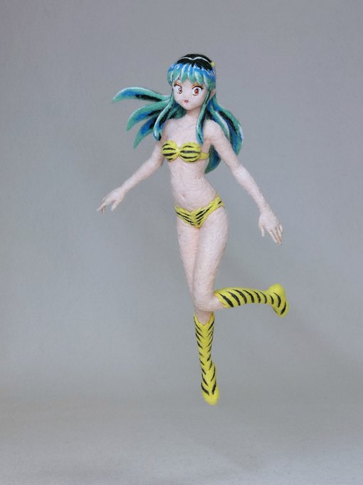 ラムちゃんを作りたい企画③ ミクさんのツインテをヒートペンで加工して缶スプレーでグラデ塗装。黒と白は筆で描きました。肌色も缶スプレーグラデです。顔というか瞳が昭和っぽい?(笑) #ラムちゃん #うる星やつら #秋本店CPC2022
