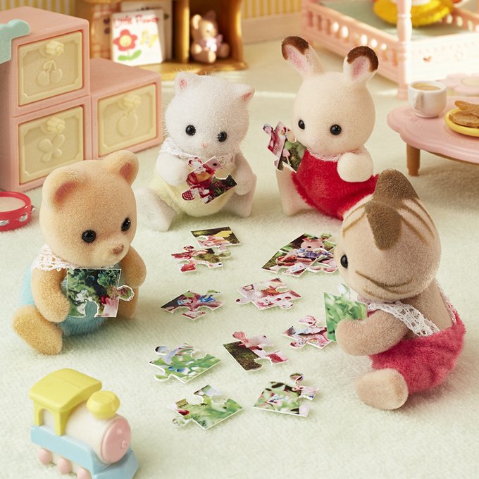 今日は国際パズルデー🧩 赤ちゃんたちもみんなでパズルに挑戦です✨ なんの絵柄ができあがるかな? #シルバニアファミリー #シルバニア #パズル #ジグソーパズル #シルバニア赤ちゃん #おうち時間