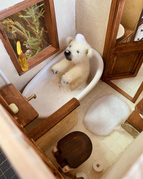 マシュマロ家の #お風呂 から、にぎやかな声が聞こえてきます♪ 「あわあわの帽子できたよ!」 「にあってる?」 「とっても似合ってる!」 アルバートの頭の上に泡で出来たかわいい帽子がのっています✨ 「もっとつくって!」 次は何を作るのか楽しみですね♪ #シルバニアファミリー #シルバニア