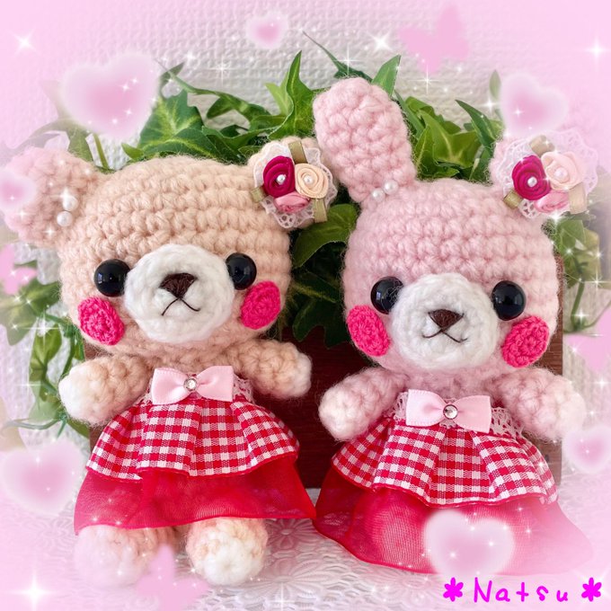 エテちゃんにも小夏ちゃんとお揃いのワンピースを作ってあげました♡🐰👗 小夏ちゃんと仲良くパシャリ📷❤(°´˘`°) 可愛く撮れたのでアイコン変更します♡ #あみぐるみ #amigurumi #かぎ針編み #crochet #ハンドメイド #うさぎ #くま twitter.com/i/web/status/1…