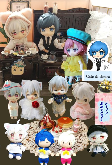 ついに、うちのそらるさんのカフェがオープンしました🎉 お店の名前は 【Cafe de soraru】にしました! お客様は7名の予約で7人の可愛いまふまふさん、1人の可愛いそらるさんが来てくれてうれしいです! ありがとうございました! #まふあーと #そらるの絵 #まふまふねんどろいど