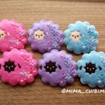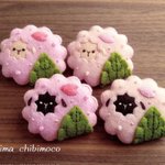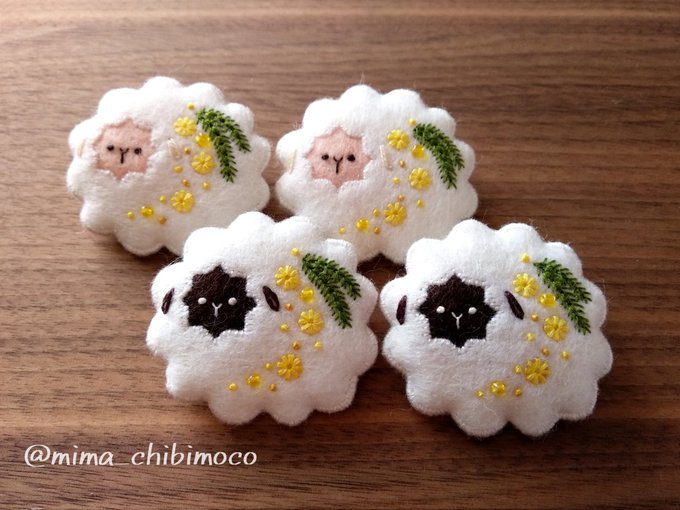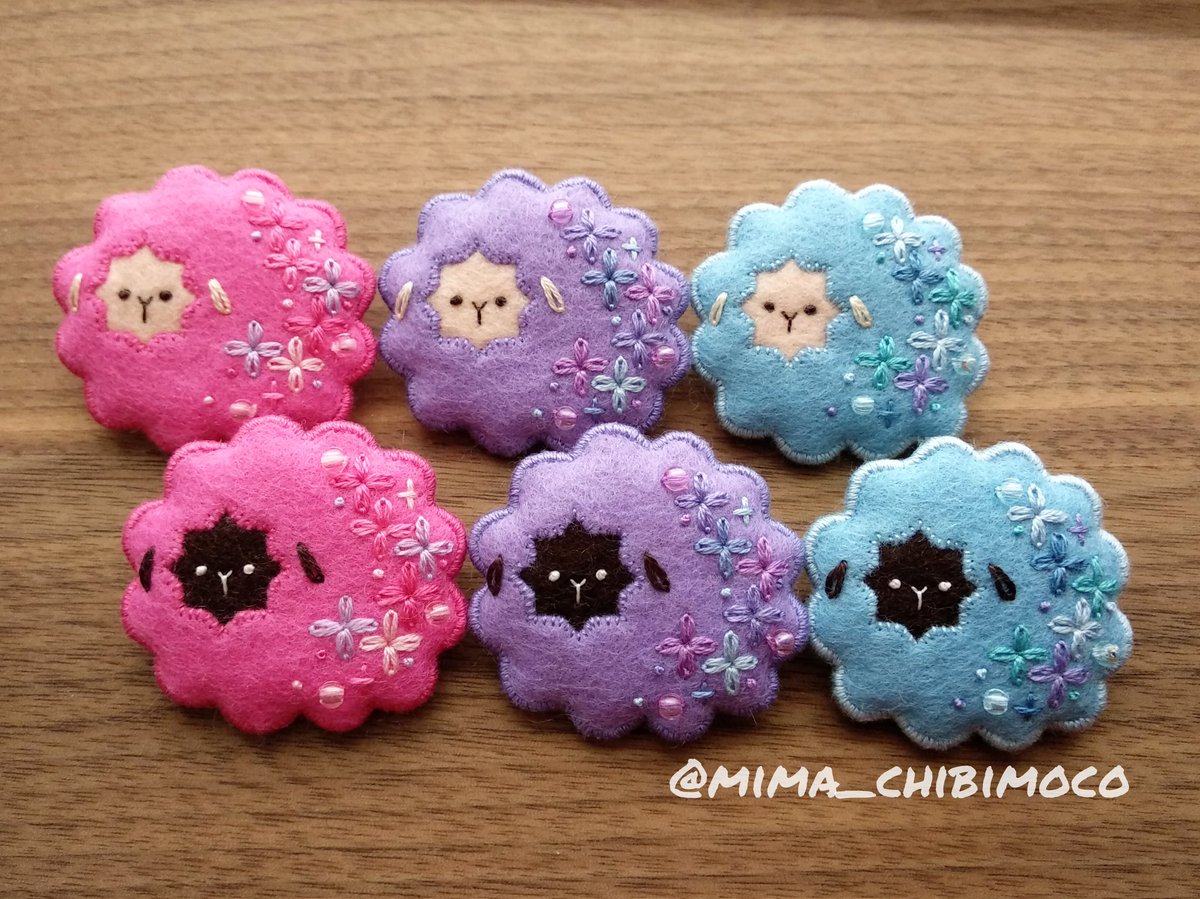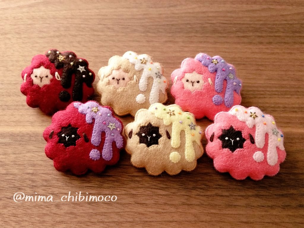 #私の世界観に触れて欲しい シートフェルトで、ちっちゃな羊の #ちびもこ さんのブローチを製作しています🐑 おめかし好きな羊さん達は、お花になってみたり、チョコレートがかかったお菓子になってみたり🐑 割と擬態好きなこも多いですね🤔