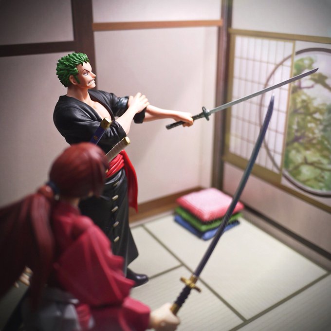 #夜のフィギュア撮影会 11/12 お題 『剣』 過去作 剣士二人で懇談中。 ゾロ「なんだこれ?刃が逆じゃねーか!これじゃ斬れねェよ。不良品か?」 剣心「いやこれは逆刃刀で…わざとそういう風に作られているでござるよ…」 #onepiece #roronoazoro #るろうに剣心 #リボルテック