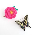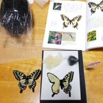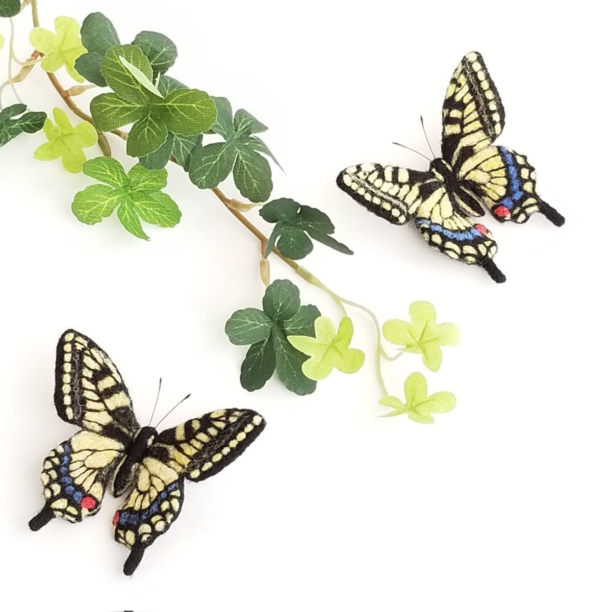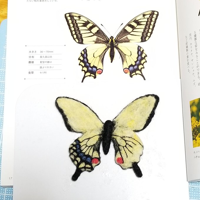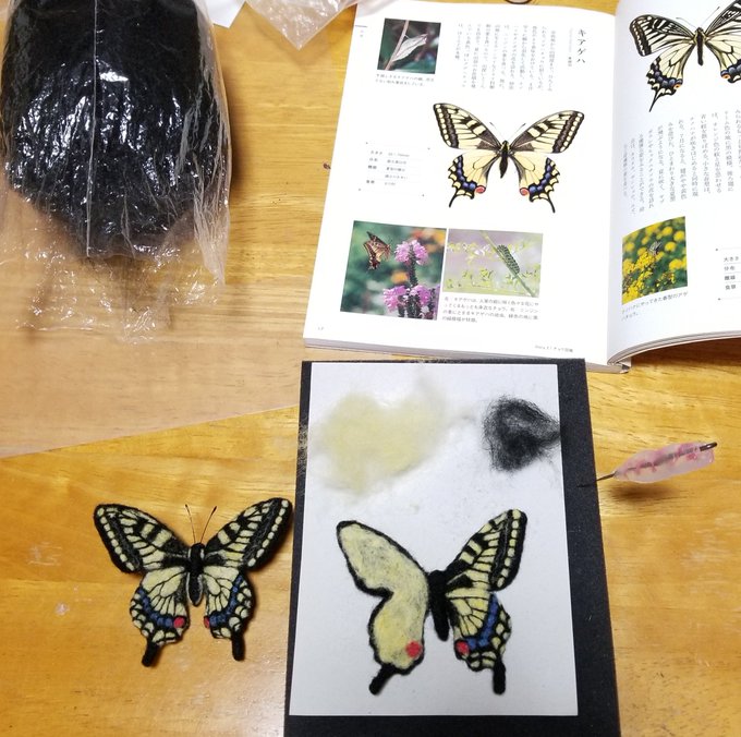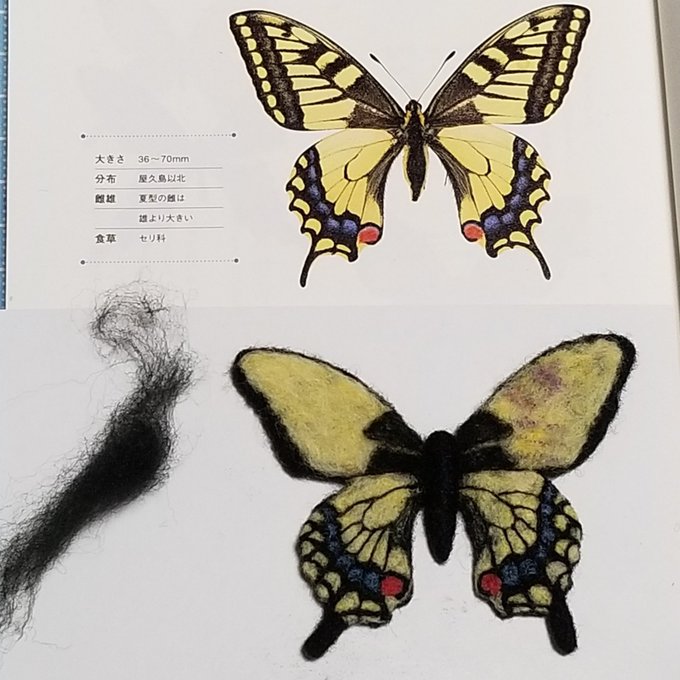 喜びとしてのイエロー 憂いを帯びたブルーに 世の果てに似ている漆黒の羽~🎶😚 あ、この歌詞レッドはないのね? 後ろ翅片方、色づきました🦋 #羊毛フェルト #アゲハ蝶 #ハンドメイド好きさんと繋がりたい
