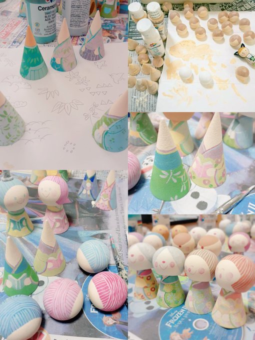 おとといからminne用雛人形の絵付けを始めてます。写真は前のもので、今日は鉛筆で下書きと肌や髪の下地塗り、次の日は着物の色、次に着物や髪の毛の模様など流れ作業を。アクリル絵の具は水彩とは全く違い、マットな質感で上に塗り重ねられるのが好き🖌️ #アナログ絵描きさんと繋がりたい