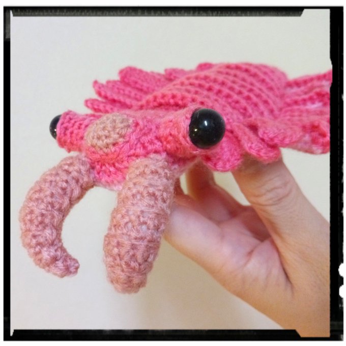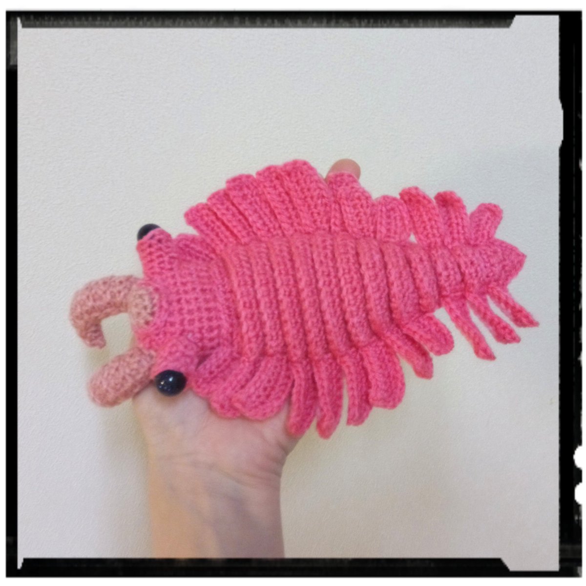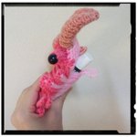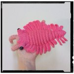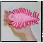 アノマロカリスのリップケース(桃色) 今回も瞳は石ではなく、コミック仕様。👀 ぶら下げられるように、持ち手付けました(๑•̀ㅂ•́)و✧ コレで、カバンの中で迷子になるリップクリームともオサラバだ!(需要? #あみぐるみ #アノマロカリス #リップクリームケース #Amigurumi #あみコレ2022