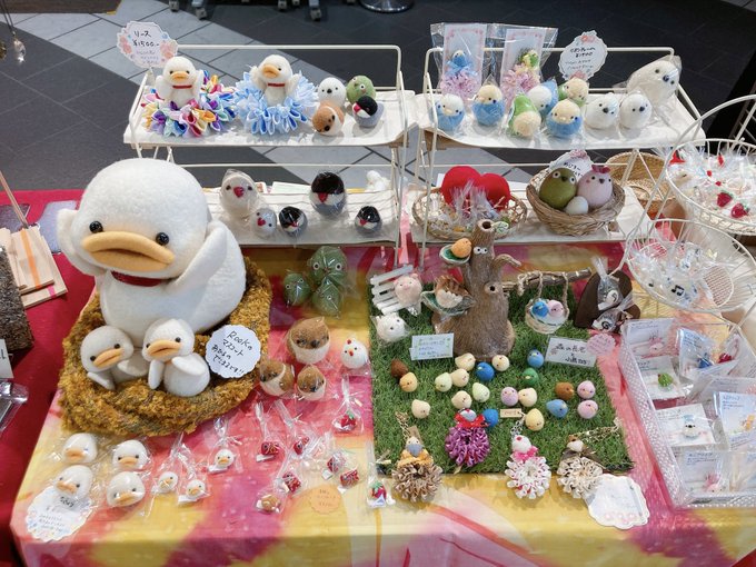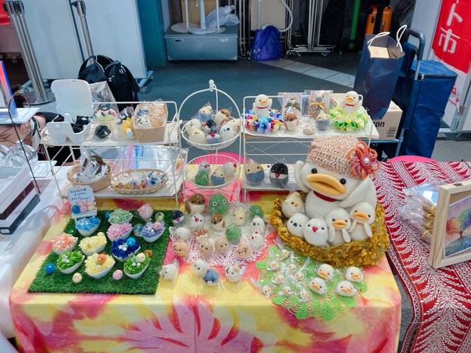 #関内駅チカアート市 ✨ Rookは、本日出店してます。😊✨ いつもの仲間たちに、今日は、セキセイインコが仲間入り。(オカメさん、お休みです🙏) ミニブローチとクリップもあります。✨ Rookの今日のお店はこんな感じ✨😆✨ #羊毛フェルト #rookの仲間たち #アヒル