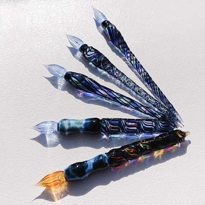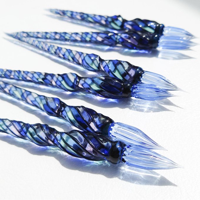 2023年新作のステンドグラスガラスペン登場です! 青系、青&緑系、緑の立体軸になります。 緑以外は薄いパープルラインの入ったペン先になっています。光源によって色の変化をするガラスです。 商品リンク↓ gensou.shop-pro.jp/?mode=cate&cbi… (価格は新作から値上げさせて頂きました) #ガラスペン #インク沼