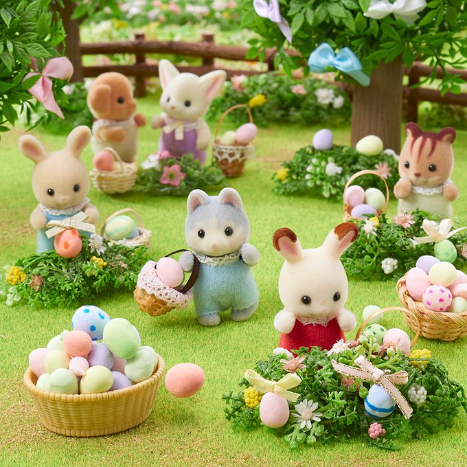 ハッピーイースター! 赤ちゃんたちはおめかしして準備万端✨ 「たまごさんもおめかししないとね!」 みんなでかわいく飾りつけです🎀 準備が出来たら、みんなでイースターを楽しみましょう♪ #シルバニアファミリー #シルバニア #イースター #たまご #イースターエッグ #シルバニア赤ちゃん