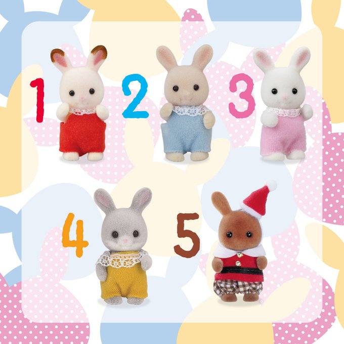 #ウサギ の赤ちゃん大集合✨ 年初めに誰と一緒に過ごしたいですか? 番号で教えてね♪ ①ショコラウサギのクレム ②みるくウサギのヘンリー ③しろウサギのソフィー ④わたウサギのチャーリー ⑤ブラウンウサギのバークリー #シルバニアファミリー #シルバニア #シルバニア赤ちゃん #うさぎ