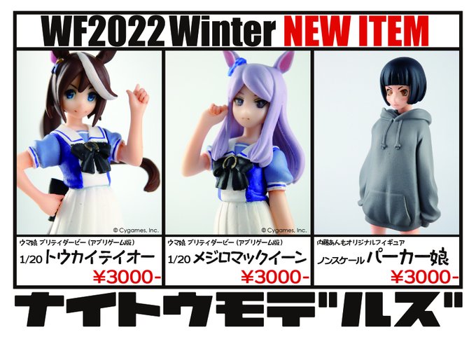 そんなこんなで前日告知。ナイトウモデルズ、明日開催されるワンダーフェスティバル2022Winterに参加します。商品はこんな感じ。久しぶりのリアルイベントです、感染対策しっかり行っていきましょう。よろしくお願いいたします。#WF2022W #ウマ娘プリティダービー
