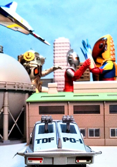 #夜のフィギュア撮影会 お題「フリー」(先日投稿しそびれたお題『連携』を兼ねます。既出。) メトロン星人とタッグを組むキングジョーを倒す為、ウルトラセブンと連携して戦う、ウルトラ警備隊! #ウルトラセブン #ウルトラ警備隊