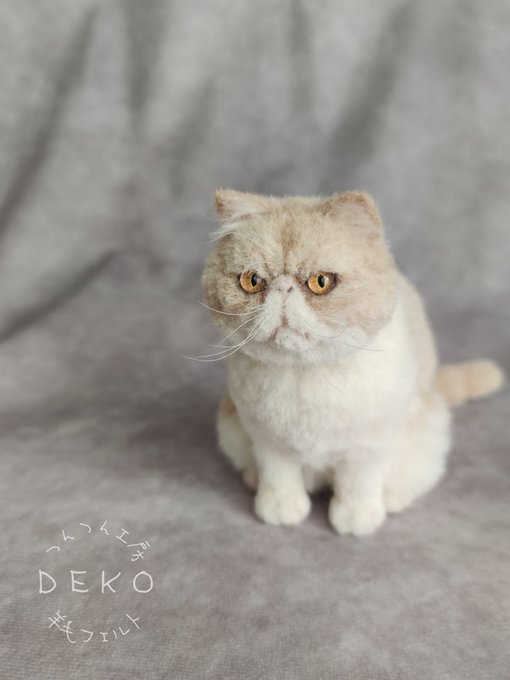 こちらのエキゾチックさんは2足で立っているのでcocoっぽい作品になっていますが、ひげがあったりとか、足の裏の磁石が無かったりとか、勝手な理由を付けて『つんつん工房DEKO』の作品としてご紹介しております。(✿^‿^) #羊毛フェルト #エキゾチックショートヘア