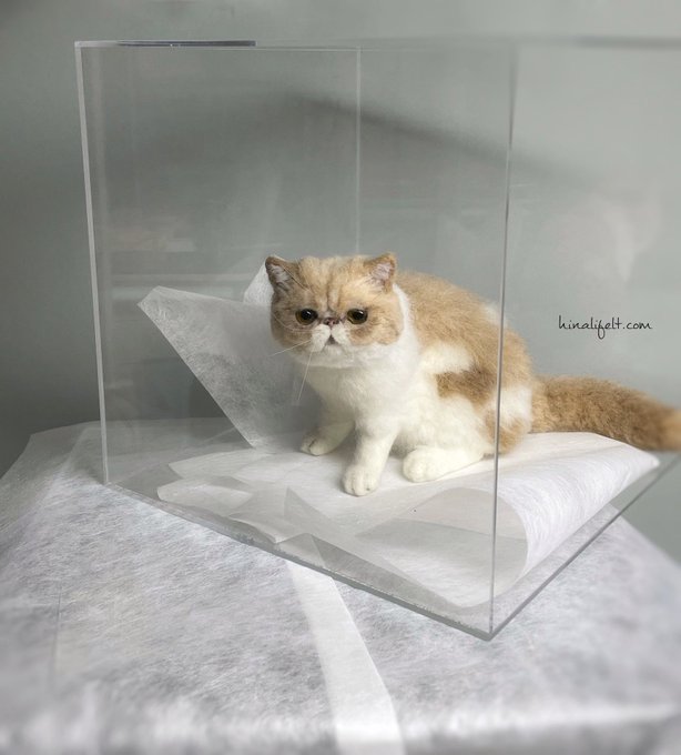 完成しました! ずっと前からできていましたがお披露目の場を失ってしまい箱の中でこの格好で潜んでいました 目つきは以前より悪くなっている気がする… #羊毛フェルト #エキゾチックショートヘア #毛繕い中 #ハンドメイド #CatsOfTwitter