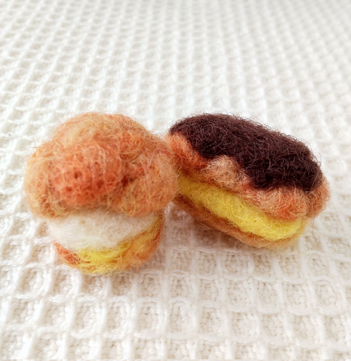 今日は #シュークリームの日 🎶 そして、#クレープの日 でもあるらしい。 けど、今日のおやつは裏をかいてバームクーヘン😋 #羊毛フェルト #felt #フェルト工房fuwari #ハンドメイド #シュークリーム #エクレア ▼creema.jp/creator/617474…