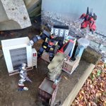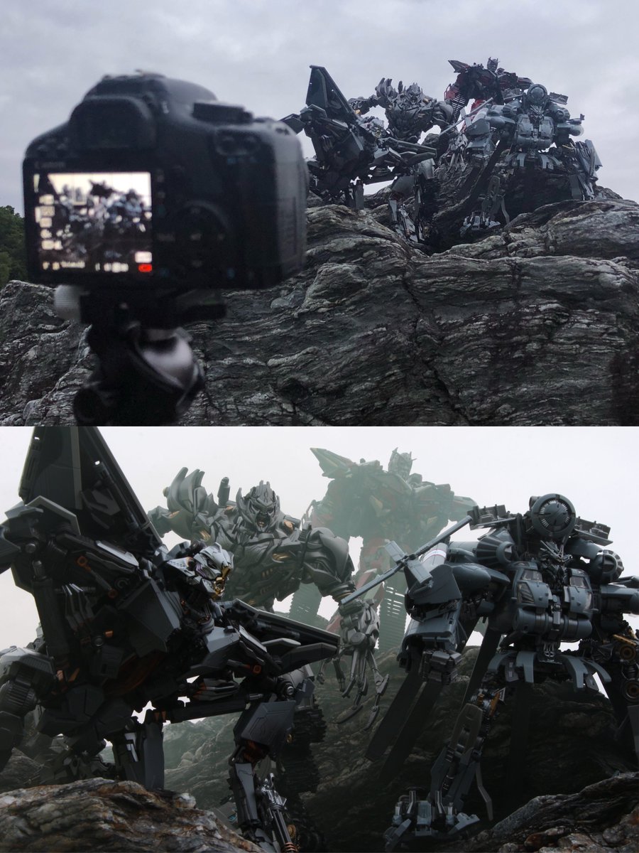 編集前と撮影風景 望遠レンズ/F値8.0 上段のオプティマスを主役として中段のビーと下段の車まで「く」の字を意識して配置しました。間を埋めるように小物や人物を置いて煙を焚き撮影。編集は本編をイメージして明瞭度とテクスチャをかなり上げてます。左側の空間が寂しく1枚合成しました。 #オモ写BTS twitter.com/captainyoron/s…