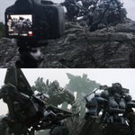 撮影風景と編集前 迫力が出せたらと思いフィギュアを高低差のある岩場に配置して下から見上げるように撮りました。今回はなるべく全体にピントを合わせたかったので、F値22と高めに設定しています。前後の距離感も出したかったので、ピントの代わりにスモークを焚いて距離感を表現しました。#オモ写BTS twitter.com/captainyoron/s…