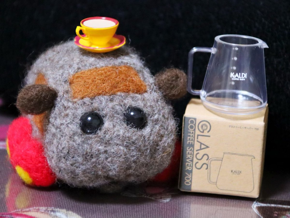 🐹モルカー×ミニチュア☕️ カルディのミニチュア😍❤️ グラスコーヒーサーバーのミニチュアは 箱付きでとってもかわいい💕 テディもコーヒーを飲みにきたようです🐹☕️ #モルカーファンアート #モルカー #カルディ
