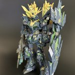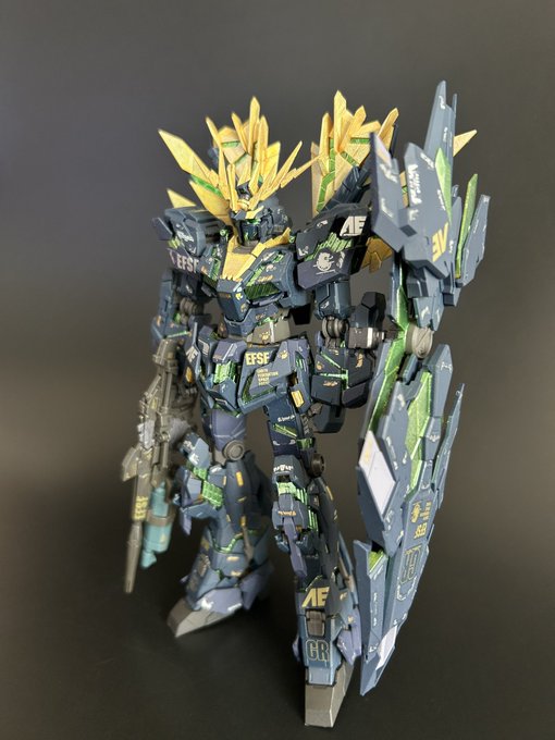 RGバンシィノルン完成しました❗️ 通常のバンシィノルンをサイコフレームをグリーンに変えて覚醒後に、黄色のパーツはホロイエローを使いました🫡 デカールはゴールドとシルバーのみを使い、いつも通り盛り盛りです✨✨ #バンシィノルン #ガンプラは自由だ #けにけにメタリック