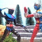 #夜のフィギュア撮影会 お題「フリー」(かつての投稿しそびれたお題『立ちポーズ』『叫ぶ』を兼ねます。過去。) 「行くぞ、キカイダー01!」 「来い、レッドハカイダー! お前には、絶対に負けん!」 #キカイダー01