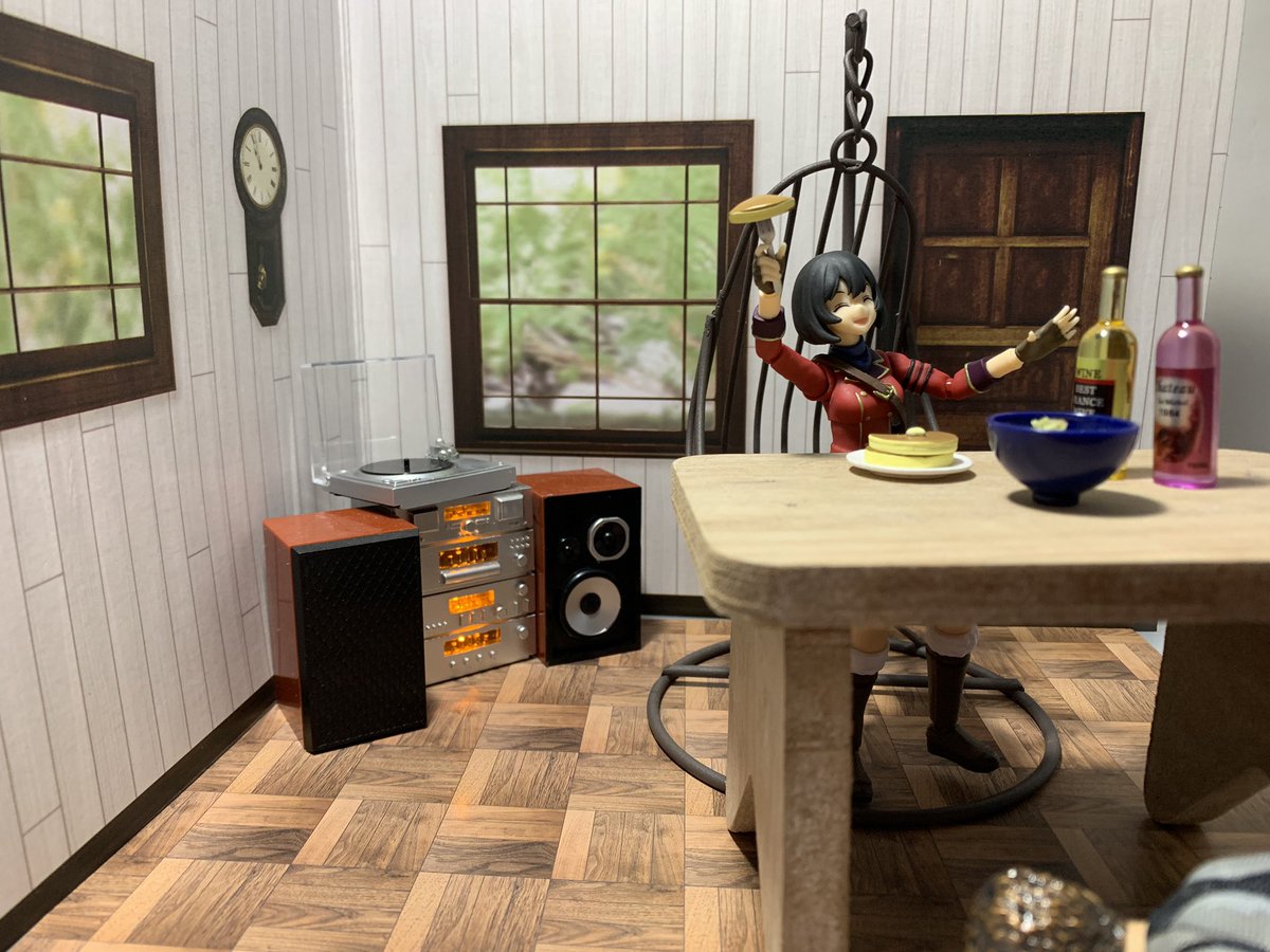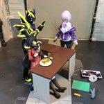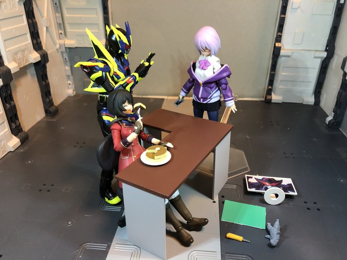 #夜のフィギュア撮影会 テーマ「休」 たまの休暇にパンケーキを食べるキリエと机を勝手に使われて怒り浸透のアカネと仲裁に入ろうとするゼロワン/飛電或人 #figma写真部 #フィギュアーツ写真部 #キリエ