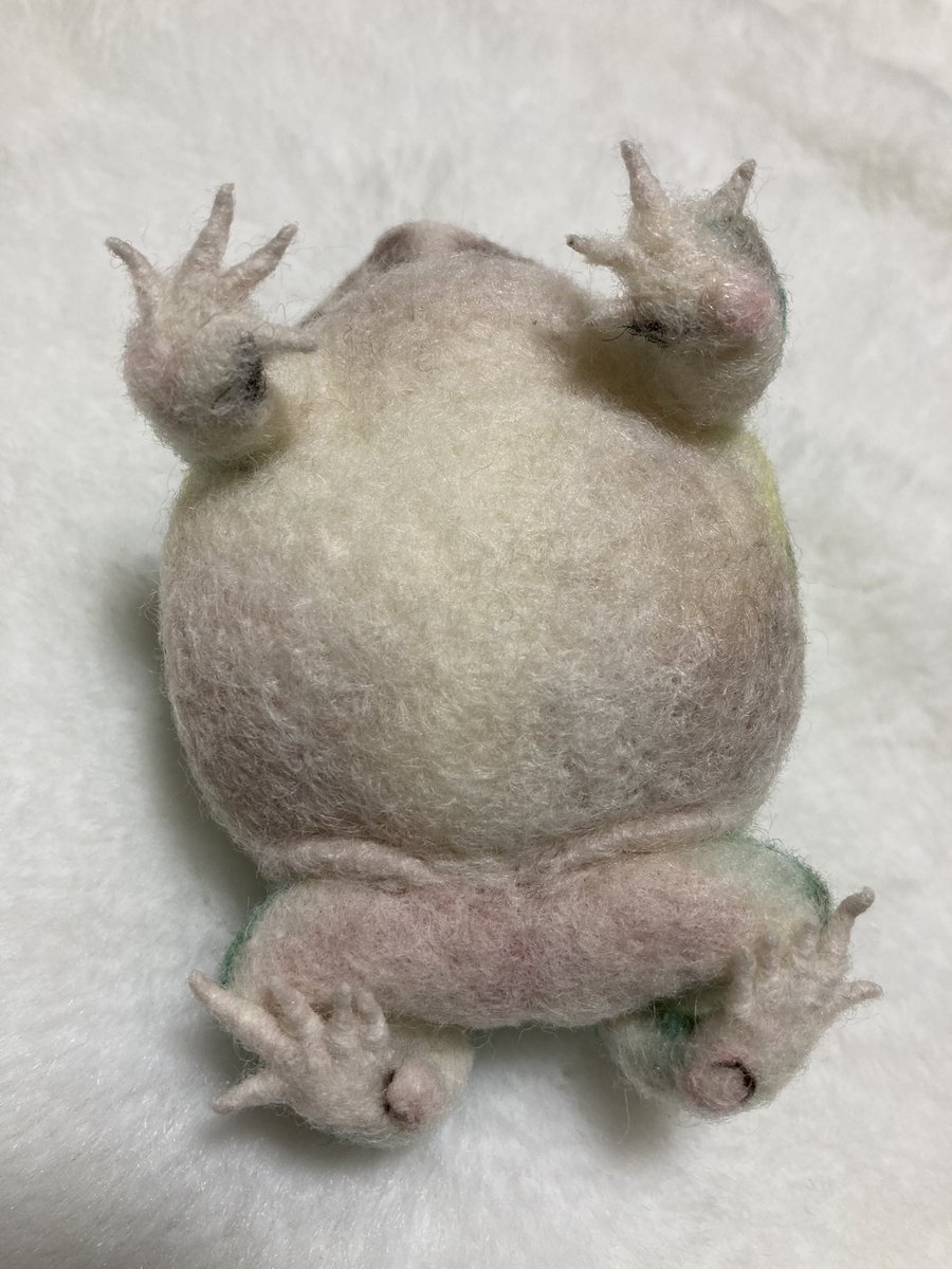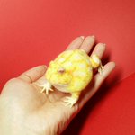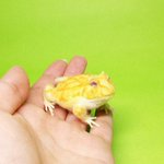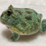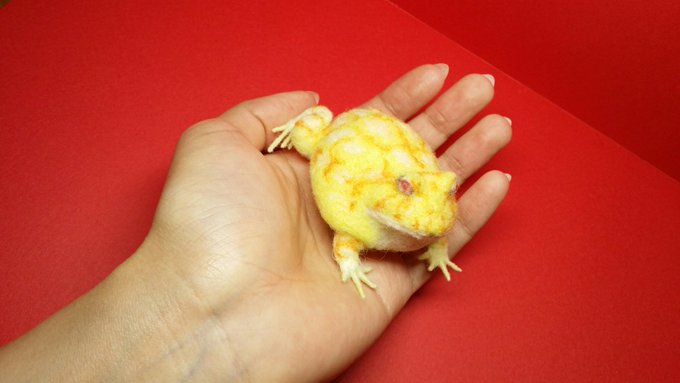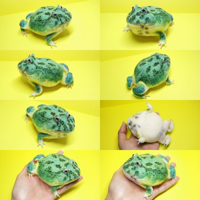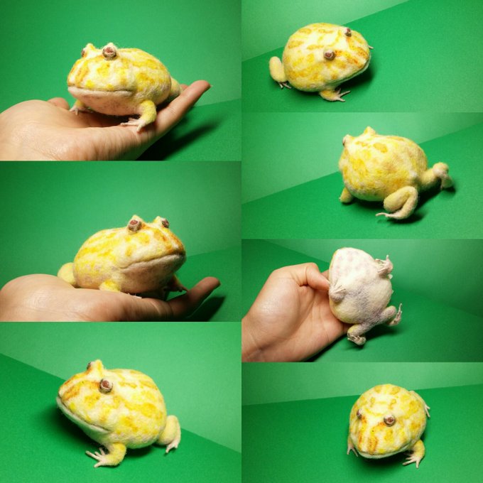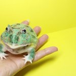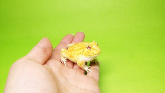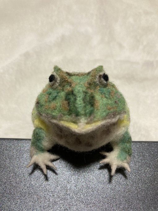 がましゃん🐸の1歳記念に、 かわもとこうさん@kawamotokou につくっていただきました💕 繊細さ、クオリティの高さに、 感動😍まるで本物✨ 抱きだこや手足裏のたこまで再現され がましゃんそっくり✨ 素敵すぎる✨✨✨ #羊毛フェルト #クランウェルツノガエル #ツノガエル