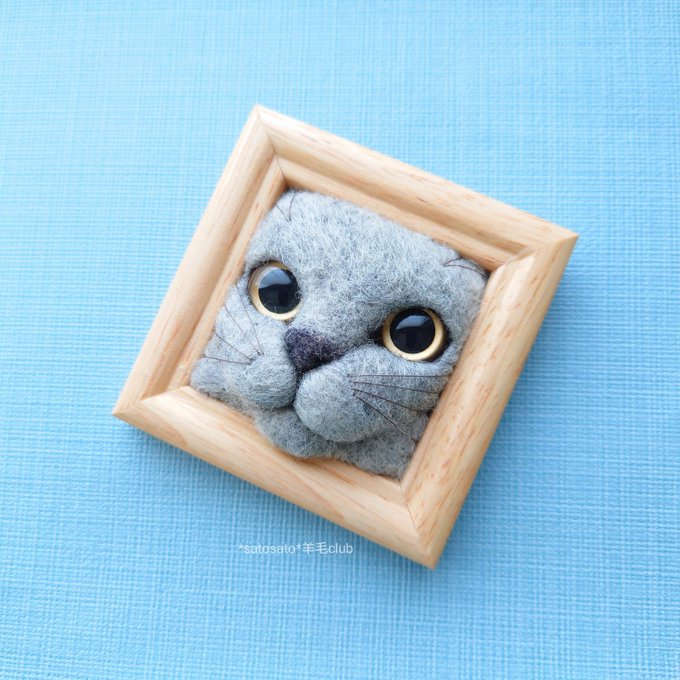 #ロシアンブルー ちゃんの目の色がグリーンだから、グレーの猫を作る時は半分くらいグリーンアイで作ります🐱 残り半分はゴールド👀です。 #羊毛フェルト #猫フレーム #グレー猫 #猫好きさんと繋がりたい #広島ハンドメイドフェス 名古屋 #クリマ