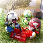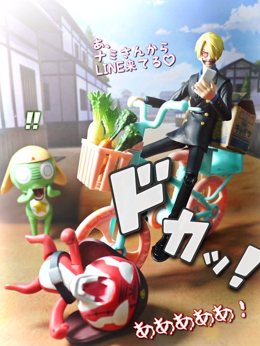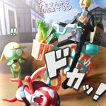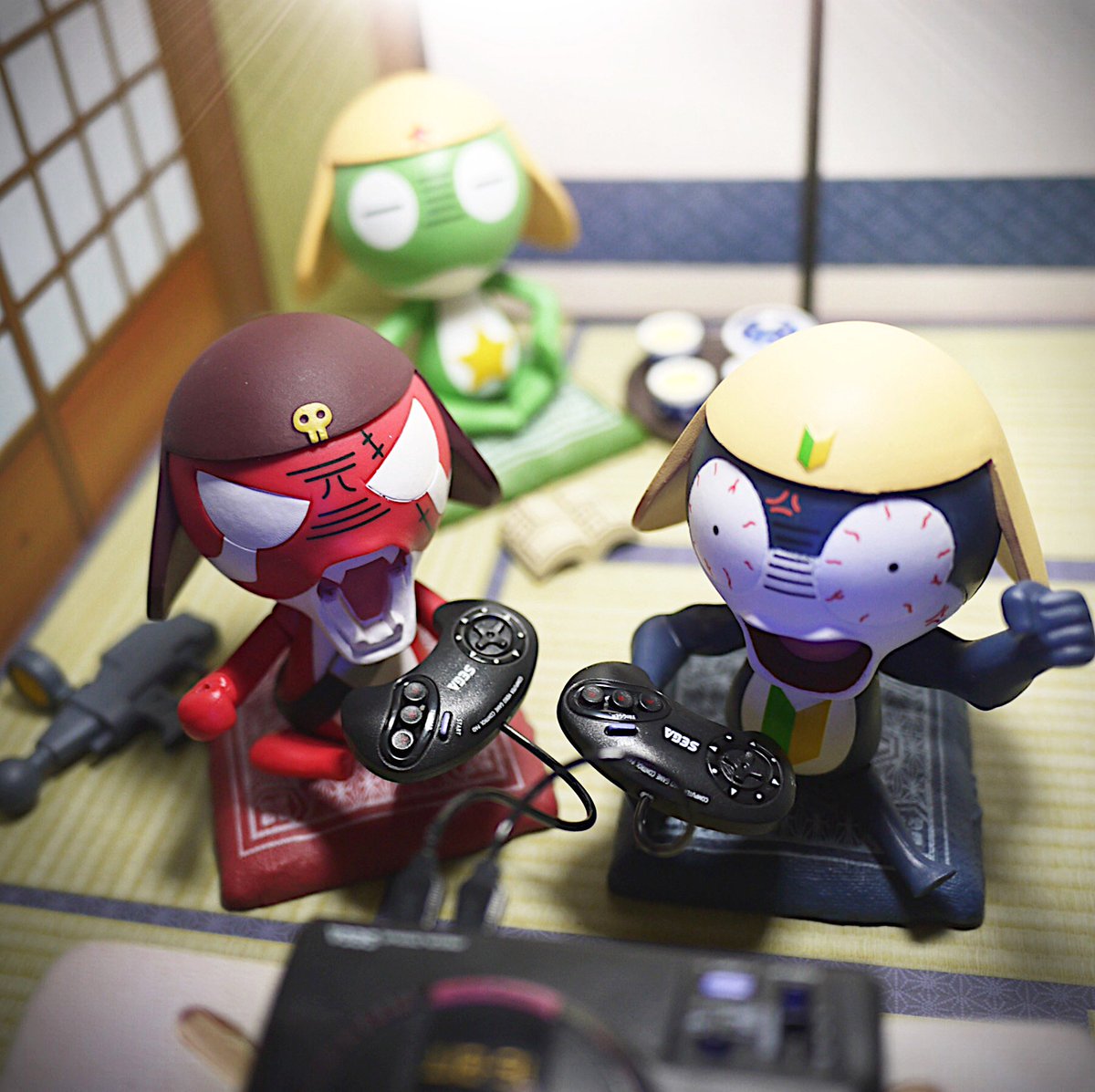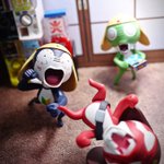 #夜のフィギュア撮影会 4/10お題 『飛』 ケロロ「うおおおおなんか飛んできたであります!!!」 ギロロ「…自業自得だな。」 #ケロロ軍曹 #海洋堂 #ガチャガチャ #カプセルトイ #ギャグ武器コレクション