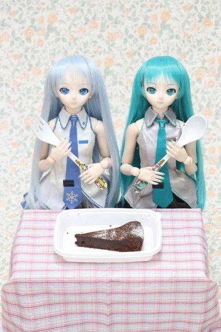 #深夜の初音ミク撮影60分一本勝負 2/11のお題【ファミレス】#深夜のドール撮影60分一本勝負 2/11のお題【フリー】フライング #ココス ミク・ユキ「COCO'Sの、テイクアウトのガトーショコラ、チョコレートの良い香りがしますねー🤤😋」