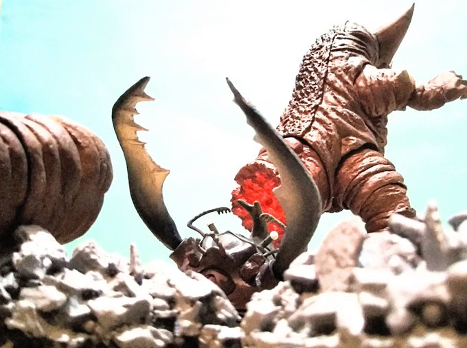 #夜のフィギュア撮影会 お題:古/懐 過去 ウルギャラ第2話で繰り広げられた古代怪獣ゴモラVS超古代怪獣ゴルザの対決。 当時見た時はゴルザが懐かしかった。 #ゴモラ #ゴルザ #ウルトラアーツ #大怪獣バトル #フィギュアーツ写真部 #ちいさな巨大特撮