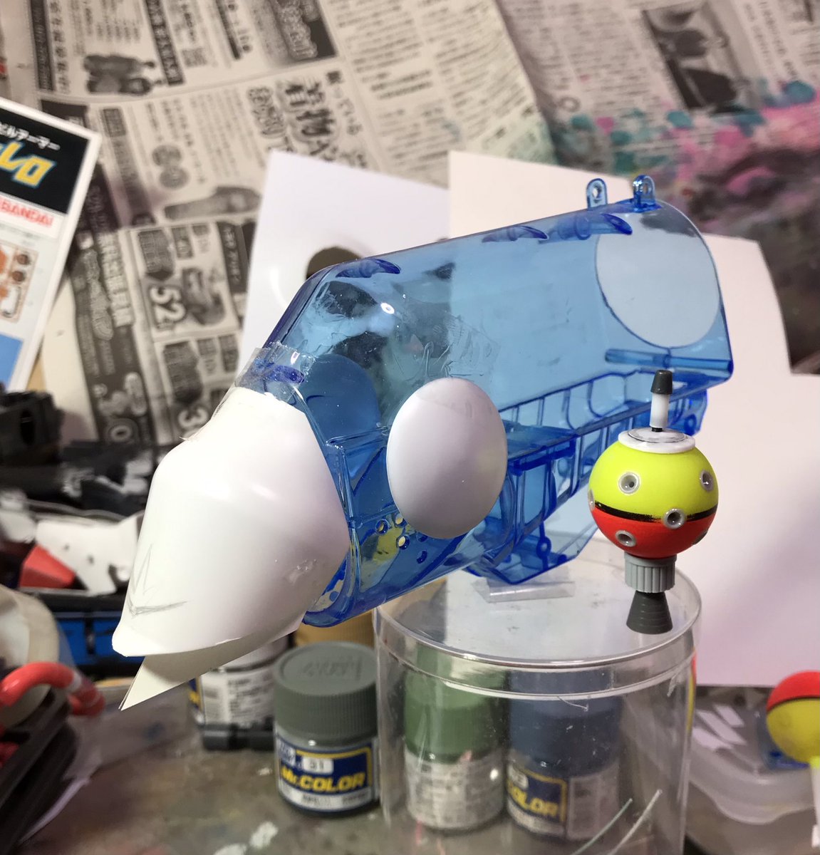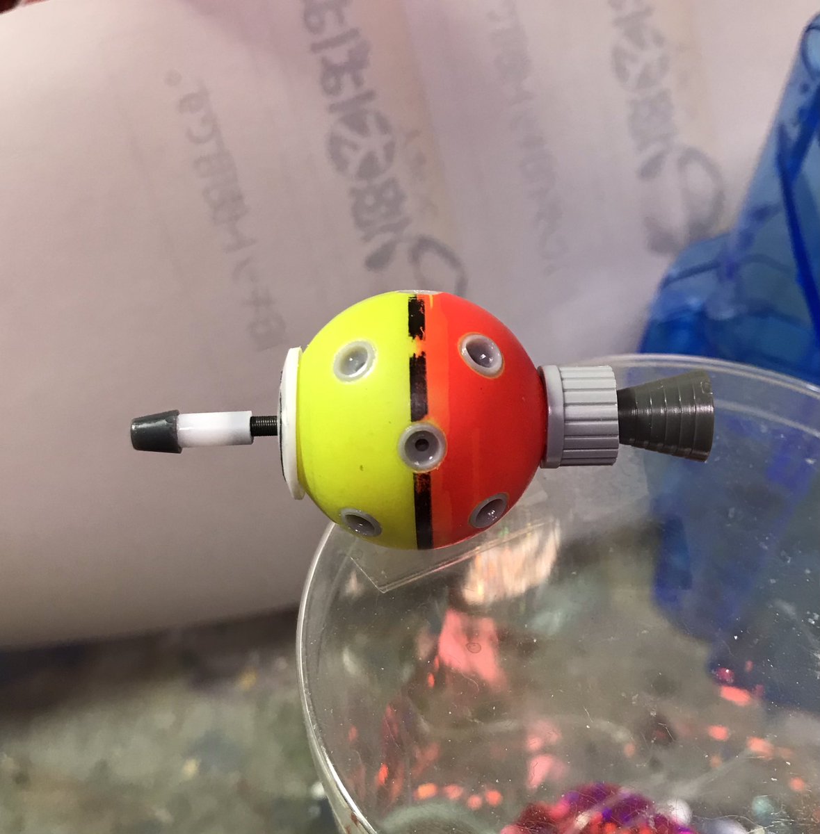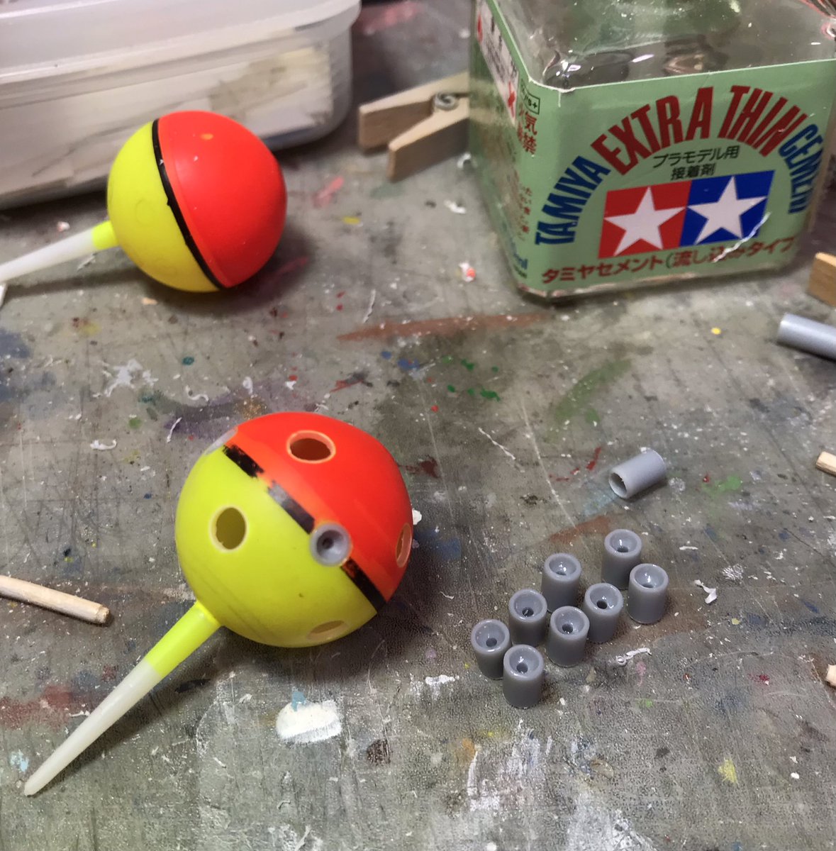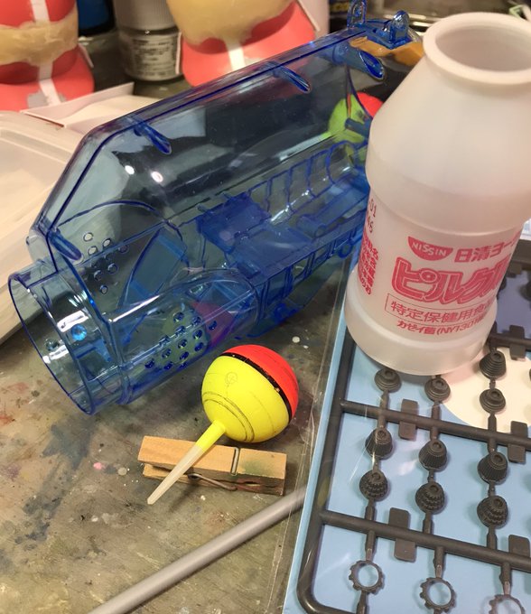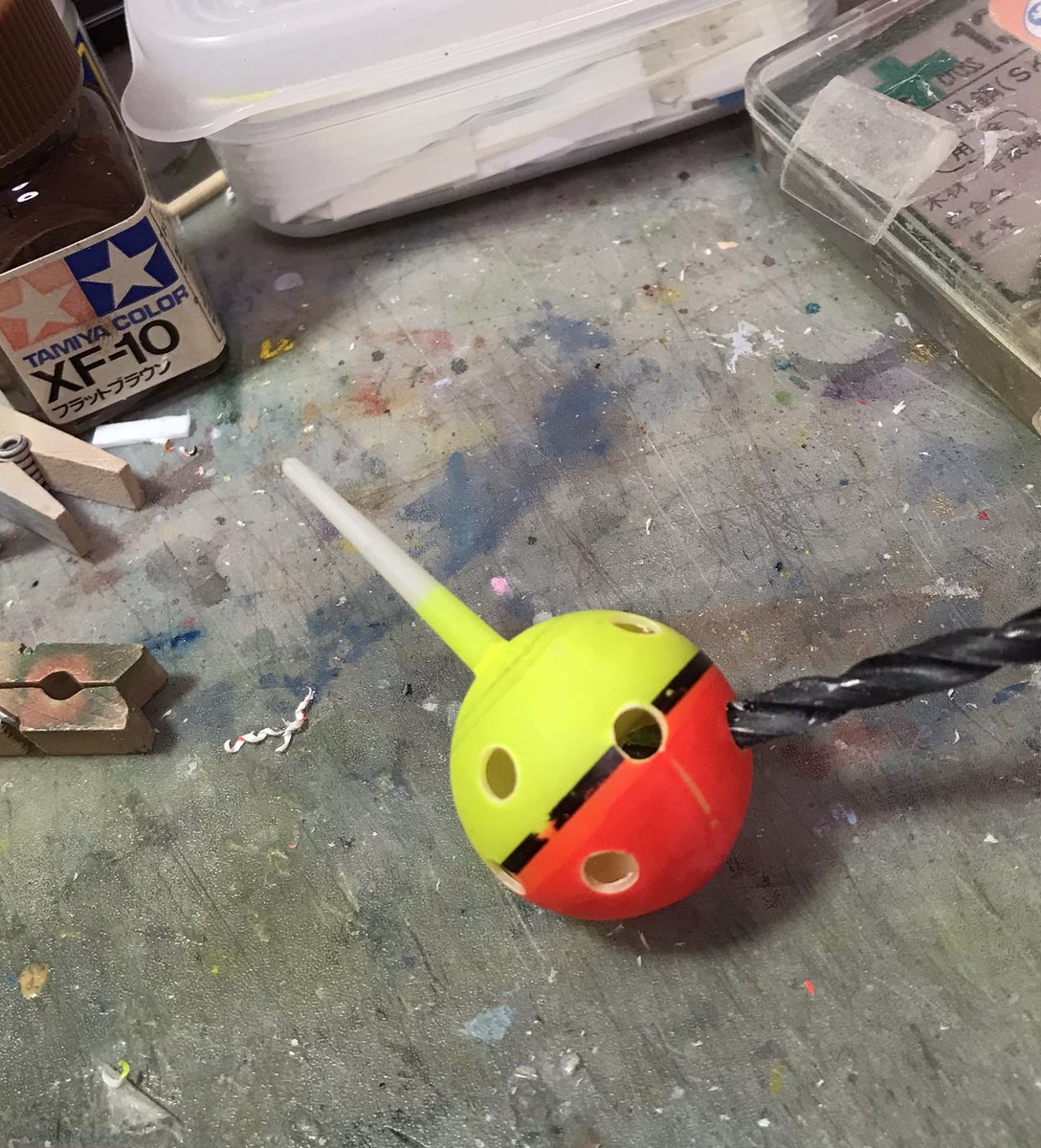 ザクレロです 模型の神様の囁きで、ザクレロ追加装備製作してます。 ウキを使って、搭載する試作実験ユニットを作ります。 ウキに穴開けてディテール入れたプラ棒を刺します試作兵器なので制御ノズルは少なくしました。 そうです脳波制御のアレです😁 #ガンプラ好きと繋がりたい #ザクレロ