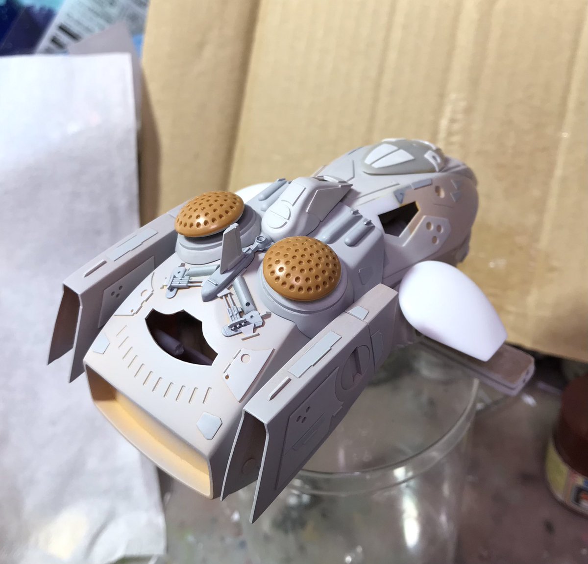 ザクレロです。 水鉄砲🔫エンジン部分周辺の基本塗装です。 エンジンとノズルの間は、メカ色になる予定です。(以前水鉄砲をカットしたのは、此処の見せ場とバランスどりの為) 二の腕の遮光の為黒を塗り、バランス確認の為仮組みしました。 #ガンプラ好きな人と繋がりたい #ザクレロ