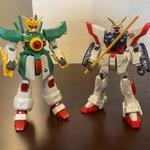 相互さんのツイートを見て気になったので、素組みのものと並べてみた! 向かって左がGフレームシャイニング、右が27年前の1995年発売の1/144シャイニング。 確かにほぼ同じサイズだ! #GフレームFA #シャイニングガンダム