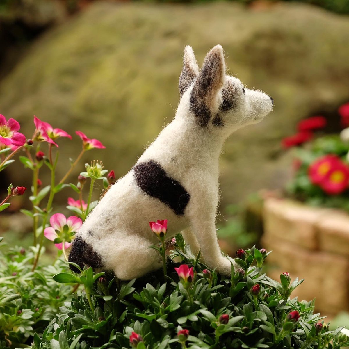 オーダー制作のたろうくん🌈 おっきなお耳は立ち、すらっと伸びる鼻面、白髪混じりのトライカラーはグレーっぽく。 たろうくんを知ってジャックのイメージを覆されました! 個性があると愛情が倍増しちゃいますよね☺️💕 背中の柄は天使の羽の形です💕 #羊毛フェルト #ジャックラッセルテリア