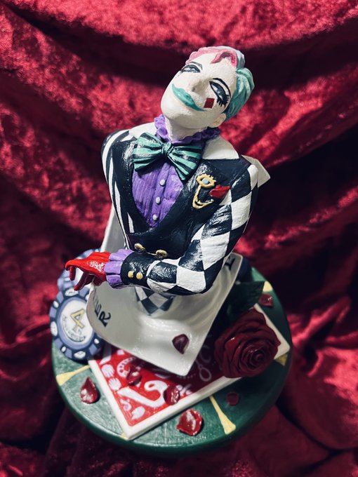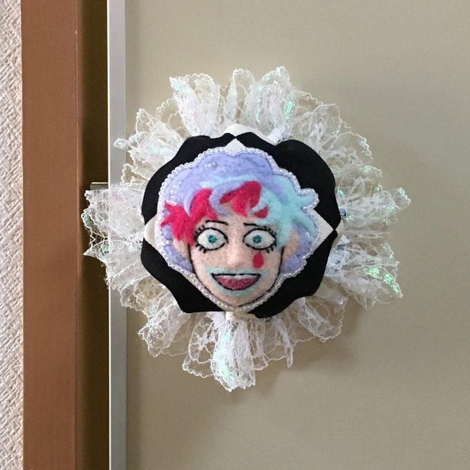 力一さんのくまぬい服作りました〜🤡🎈🧸🎀 テーマパークのビジュアルを意識して首周りにピンクのフリフリを🎀🩷 紫とホワイトのフリルで可愛らしくドレスにしました💜 #にじさんじホワイトデー2023 #にじさんじ #ジョー設展