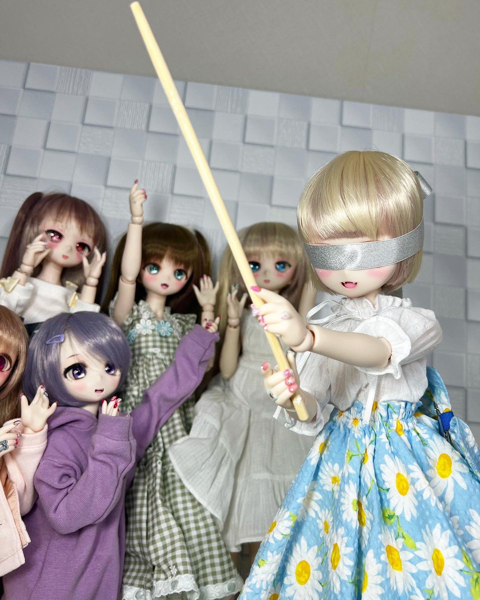 スーパーで可愛いサイズの小玉スイカを見つけたので、娘達にプレゼントしました🍉✨娘達は早速スイカ割りを開始!花音が姉妹達の声に応じてスイカの元に近づいてます。上手に割れるかな?👀✨ #もこもかっこ #THユカリnail #MDDはいいぞ #p_house #missantroop #ぷちりぼん #スイカ割り #すいか割り