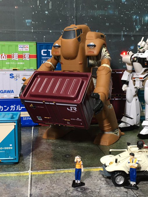 #夜のフィギュア撮影会 お題『挑戦』 挑戦的なラインナップ!?B社のROBOT魂よりもずっと前に発売された作業用レイバー!タイラント2000!パトレイバーの世界観には欠かせない存在なのだ😄 #パトレイバー #機動警察パトレイバー #イングラム #超合金 #タイラント2000 #セリア #100均 #ソフビ #オモ写
