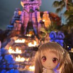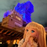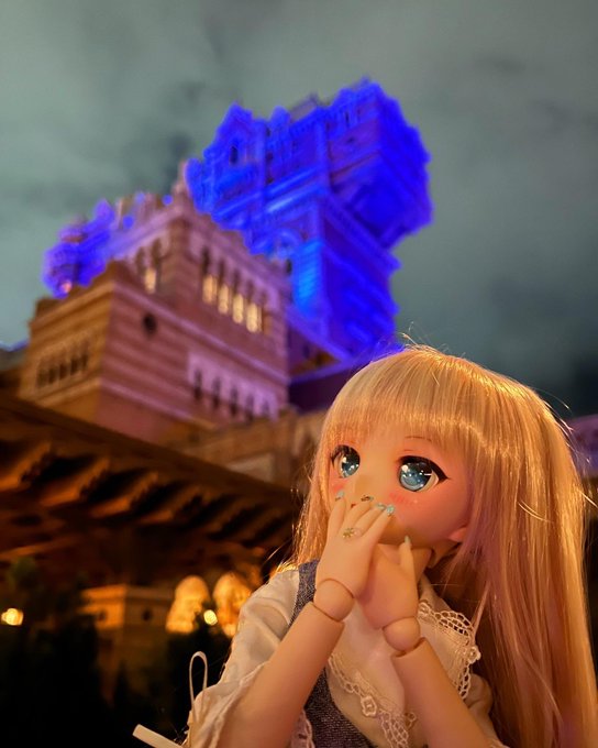 . 夜のタワー・オブ・テラー👻ブルーにライトアップされて、昼間よりも怖そうな雰囲気です💦怖がっている鈴音とは対照的に、水音は自分のイメージカラーだと喜んでいました😆💕 #もこもかっこ #THユカリnail #MDDはいいぞ #ドル沼CH #p_house #ディズニーシー #タワーオブテラー #タワー・オブ・テラー