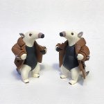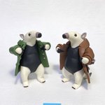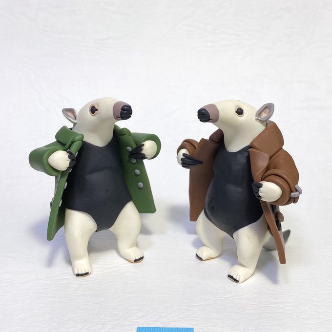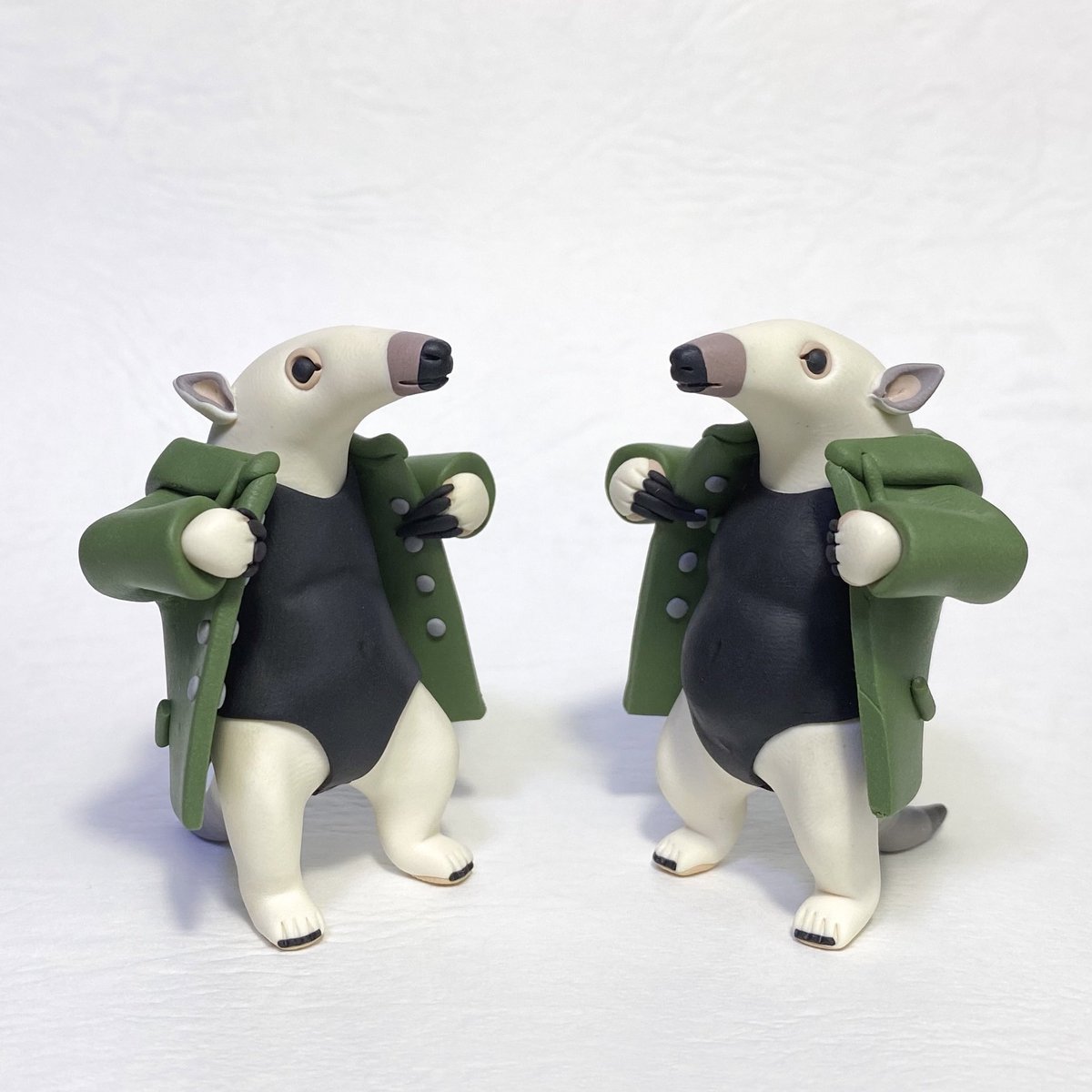 てことで4年ぶり『露出狂のコアリクイ』 モッズコートとトレンチコート、腹が出てる・出てないやつの計4パターン。 威嚇のポーズと毛の模様から連想したらこんなことになりました。現実でやるのは犯罪なのでダメよ。 #デザインフェスタ55 で展示販売します。 #デザフェス