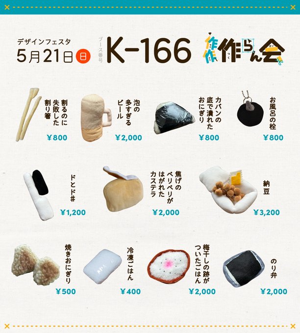 📢#デザインフェスタ お品書き第二弾 日常や絶望のぬいぐるみも出展します ぜひ遊びに来てください〜🍺 日時:5/21(日) 11:00〜19:00 ブース番号:K-166 会場:東京ビッグサイト 西&南ホール全館 #デザフェス57 #デザフェスお品書き 値段変わったり、受注生産になる場合もあります📢
