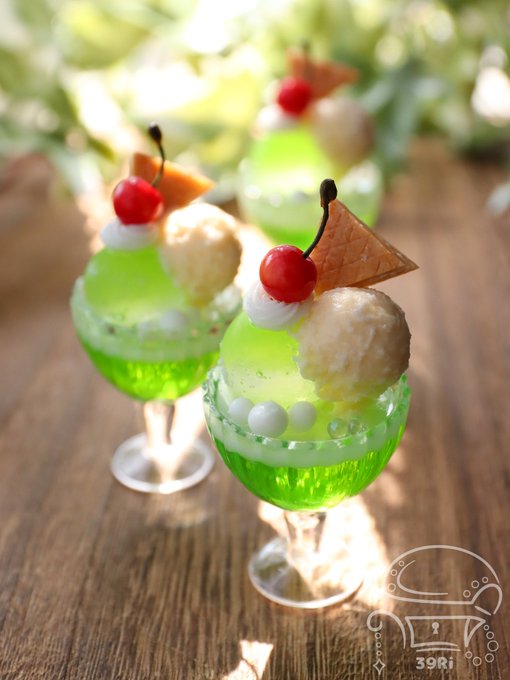 いつもより少し大きめのメロンクリームソーダ新しく作りました *ˊᵕˋ)੭🍈🍒 今日は更に暑かったですね💦 見て少しでも涼しくなりますように.。o○ #フェイクスイーツ #デザフェス #デザフェス57お品書き