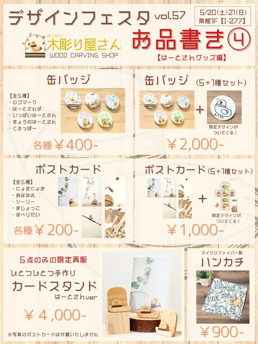 『ぽっぽの木彫り屋さん』 〜デザフェスvol.57〜 🪵お品書き【第3弾】🪵 本日は ④はーとさんグッズ をご紹介!! 前回のネット販売の際、即完売したカードスタンドも今回、5点限定で再販します😆 ○南館1F【I-277】 5/20(土),21(日) @東京ビッグサイト #デザフェス57お品書き #デザフェス57 twitter.com/warkingpoppo/s…