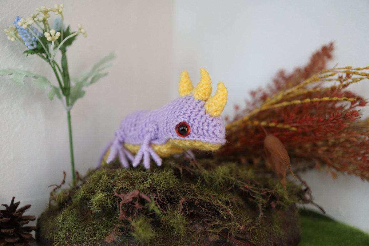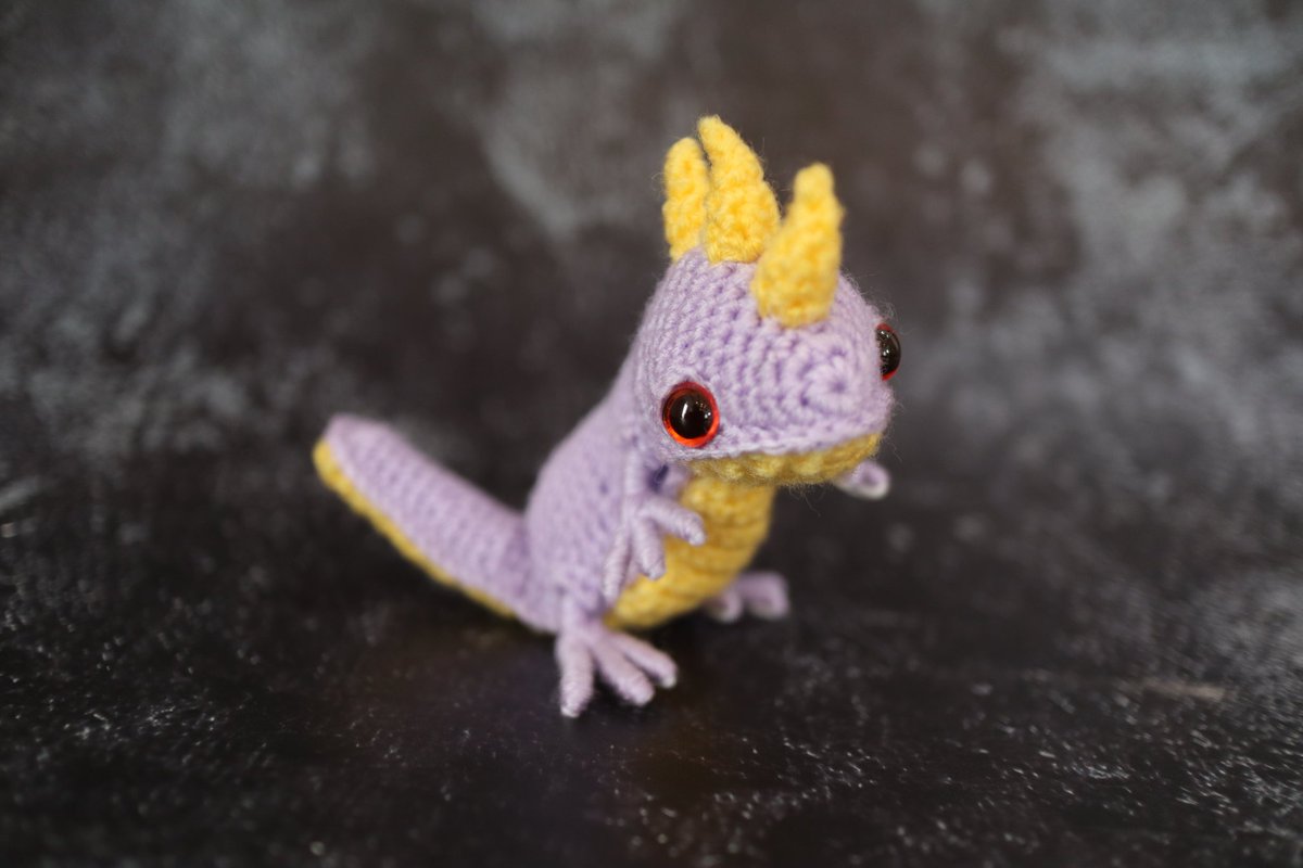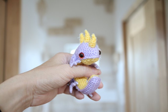 オオサンショウウオを作りました ツノを生やしたことによって、火の精霊サラマンダーになったトカゲさんです ぽっちゃり体型がチャームポイントです #あみぐるみ #サラマンダー #オオサンショウウオ #トカゲ #ドラゴン #crochet #amigurumi