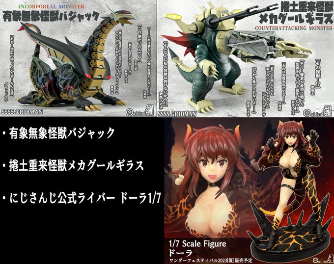 ワンフェス2023夏のお品書きです! メカグールギラス、バジャック、ドーラ様の3作品、それぞれ10個ほど持っていくのでよろしくお願いします^_^ 完成品も会場で展示します! #WF2023S #WF2023夏 #SSSS_GRIDMAN #GRIDMAN_UNIVERSE #ドーラの宝物庫