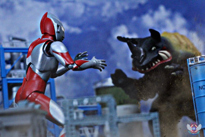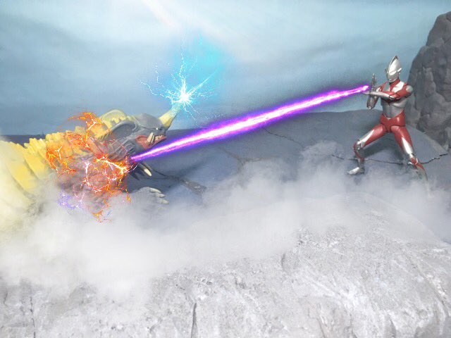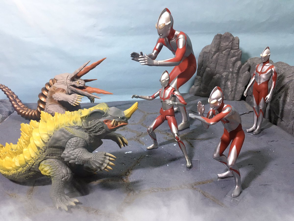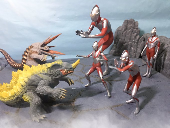 #夜のフィギュア撮影会 お題『嘘』 ネロンガとガボラがチビすぎてウルトラマンにまとめて瞬殺されてた😆 #シン・ウルトラマン #シンウルトラマン #ダイナクション #DYNACTION #ウルトラマン #ULTRAMAN #ネロンガ #ガボラ #ムービーモンスターシリーズ #オモ写