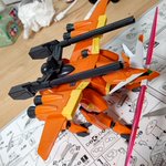 ハロウィンカラーのメタスカスタム、飛行形態でハロウィン最終日に飛行形態で見参! 小さいながらも方に付けた羽がMS、WRの両形態でもアクセントとしての狙いです。#ハロウィンなのでみんなのオレンジ色の作品が見たい #夜のフィギュア撮影会 テーマ「飛」過去