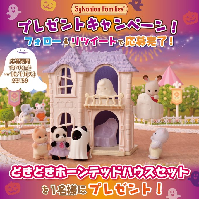 #シルバニアファミリー プレゼントキャンペーン✨ このアカウントをフォロー&RTをしてくれた方の中から抽選で1名様に「どきどきホーンテッドハウスセット」をプレゼント🎁 ①[@SylvanianJP]をフォロー ②この投稿をRT 10/11(火)23:59 〆切 #シルバニア #ハロウィン